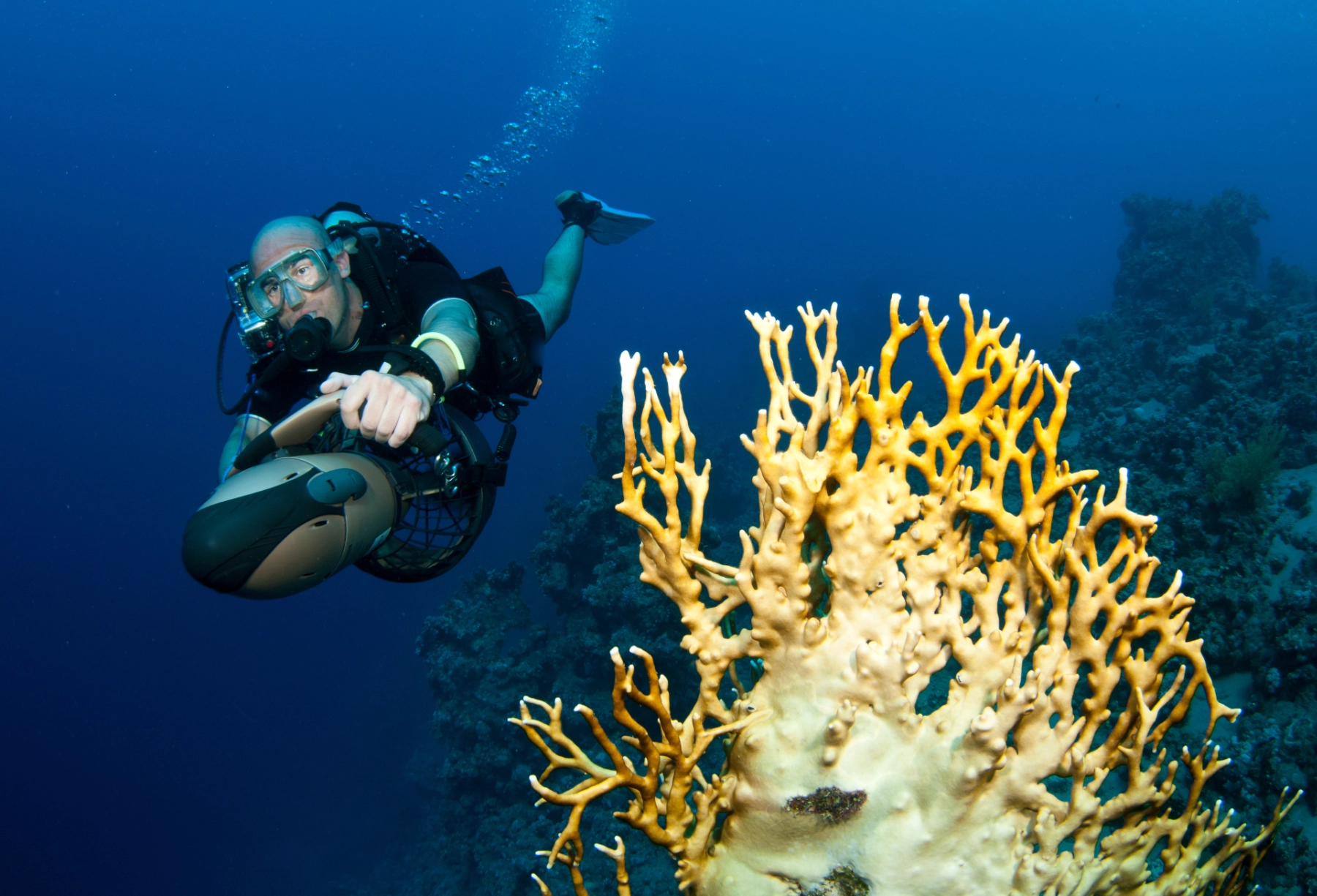إذا تعطل جهاز الغوص المتنقل (DPV)، فقيّم إمكانية إعادة تشغيله أو إصلاحه تحت الماء. إذا لم يكن كذلك، فانتقل إلى تقنيات الغوص التقليدية. من الضروري وضع خطة مسبقة للغوص في مثل هذه الحالات، تتضمن تحديد نقطة التقاء أو بروتوكولًا محددًا للغوص.